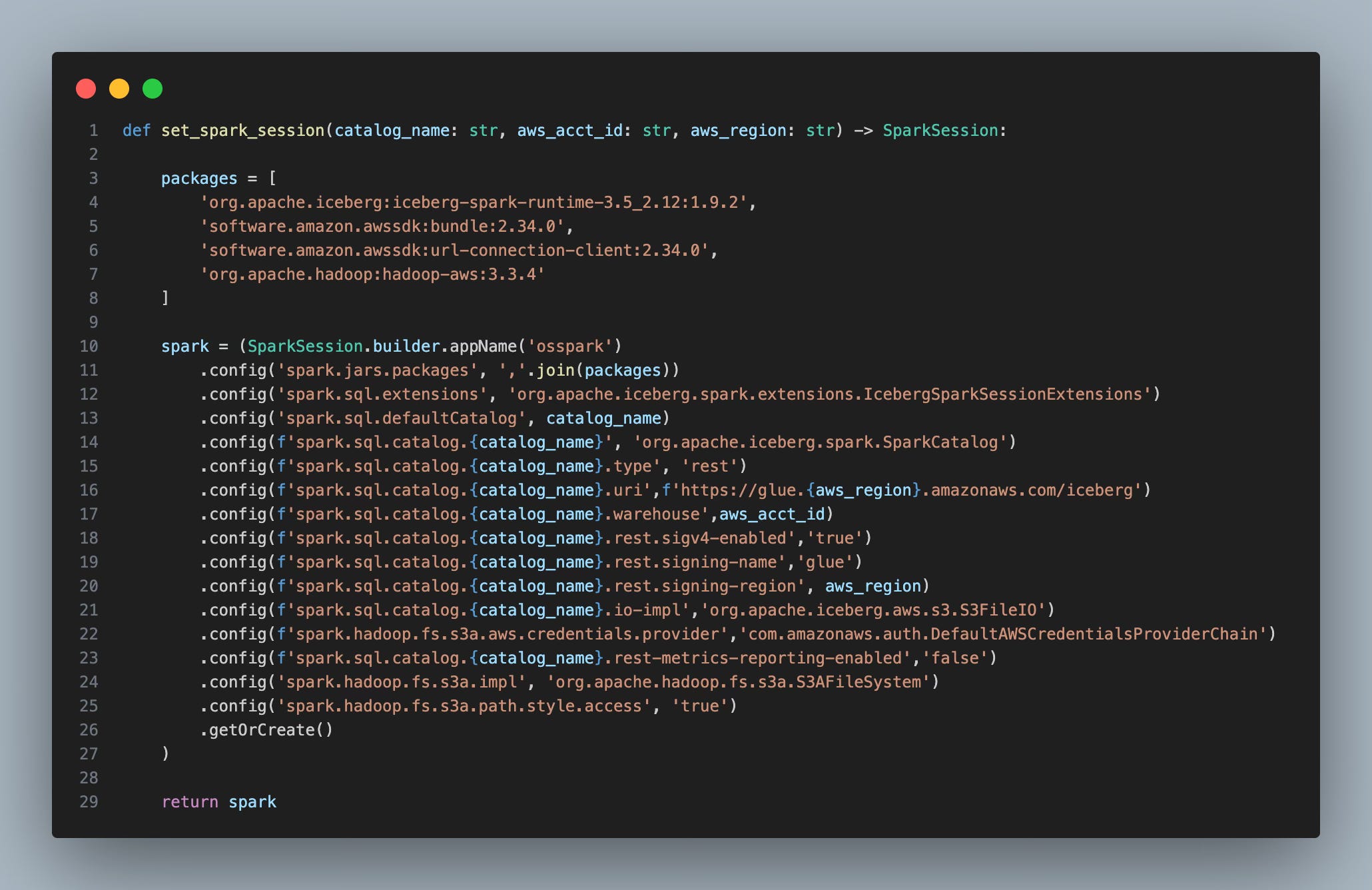 The spark config for AWS Glue Iceberg rest is no different. Luckily, AWS does provide this document that gives us a template. However, the packages referenced are a few years old, and we like to live dangerous and in the now…thus, this is what my pyspark config ended up looking like, in all its glory: