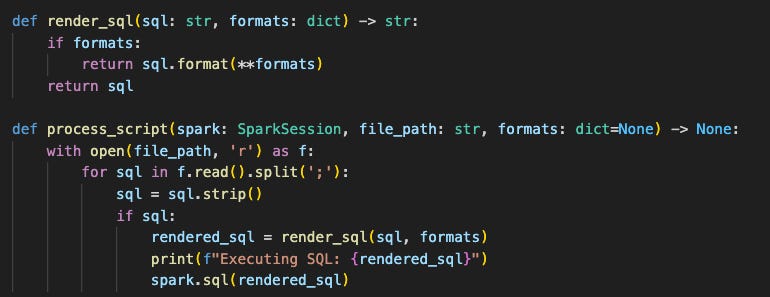 Below is the helper function I built to handle these scripts; this is a common trick when I need spark to do more than just make data frames; these functions read in the file, split them into their various segments, and add in/format variable substitutions where applicable.