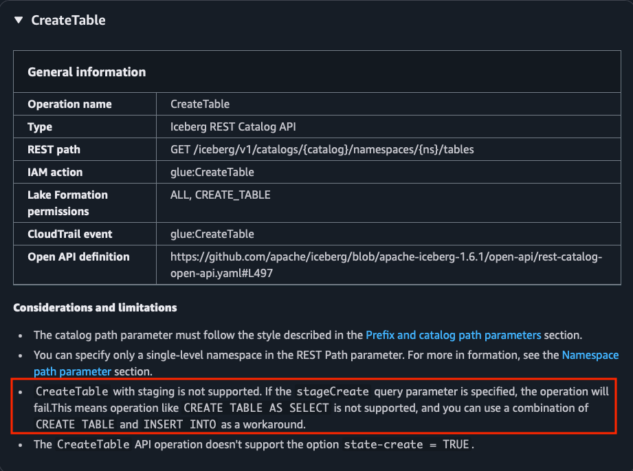 According to the AWS docs for the Iceberg Rest Catalog, they make it clear as daylight that this is the actual function call to execute a CTAS (as seen in the screenshot below). Amazon states you can just create the table and run an insert statement as a workaround.