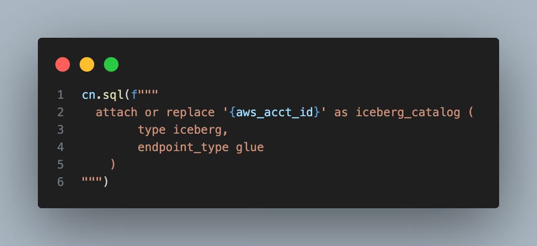 For posterity, this is what it looks like to attach an Iceberg AWS Glue Rest Catalog in Duckdb:
