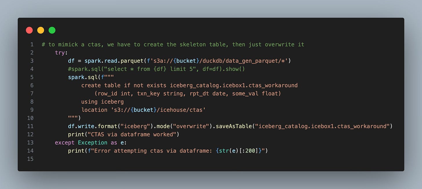 According though to Apache Iceberg docs, CTAS is absolutely a supported statement; thus, AWS just fell asleep at the wheel on this one. My hunch is the engineering must have been a lot of extra work and they put it on the back burner.
