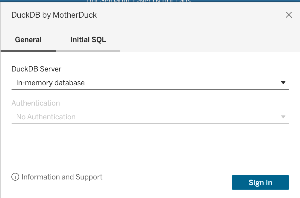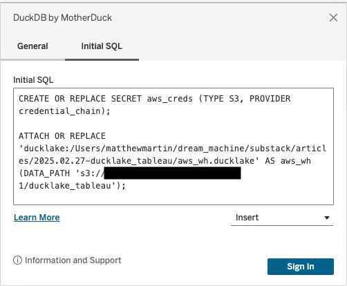 But then lo and behold, if you read further down on DuckDB’s Tableau documentation, MotherDuck has put out their own custom connector for Tableau that does allow an init sql statement. So I figured, is this all I need? Let’s go try: