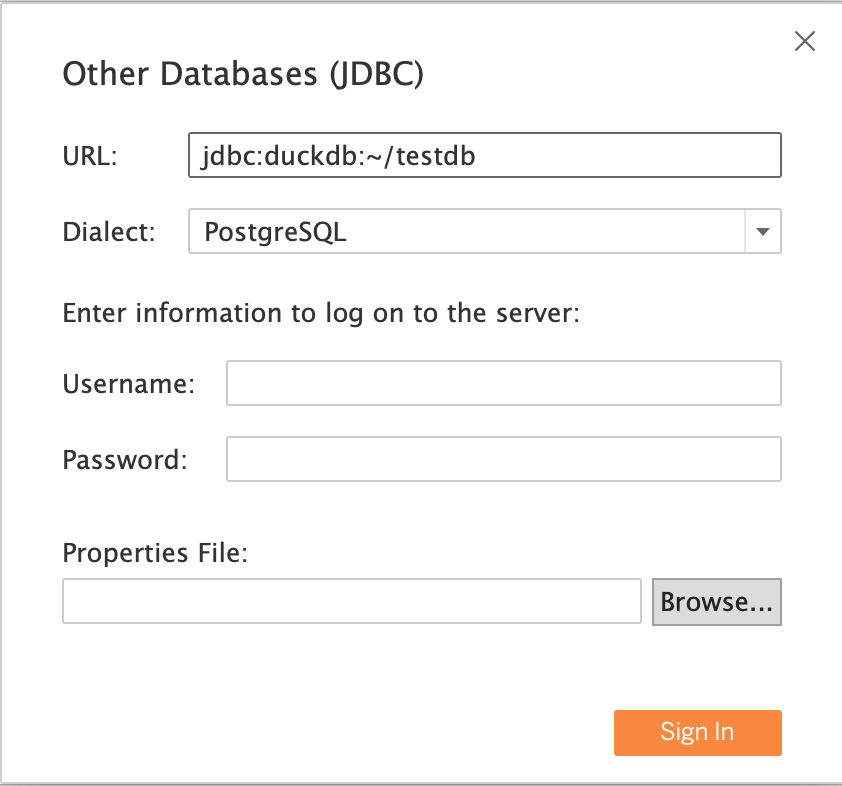 Tableau desktop can be downloaded as a free trial, which is what I did. And DuckDB has good documentation that can be found here that shows how to connect to Tableau. So for my first attempt, I clicked on the “Other (JDBC)” connector for tableau, set the dialect to Postgres on the drop down and then connected to a duckdb database like this: