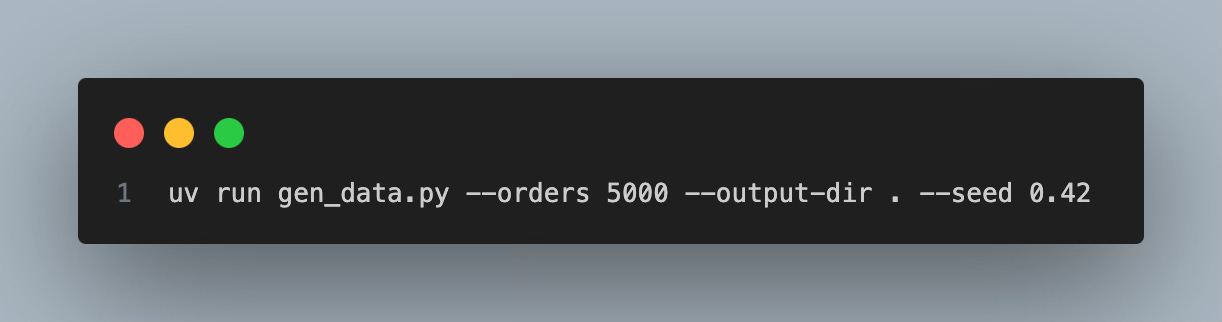 For today’s article, I will use a python script and duckDB to build out some fake datasets - a classic order header and detail, with the theme of this one being a store that sells flashlights. Honestly though, thanks to the advancements in LLM’s over the last year, I just gave copilot and GPT 5.3 codex this prompt and it generated the python script in less than 10 seconds: