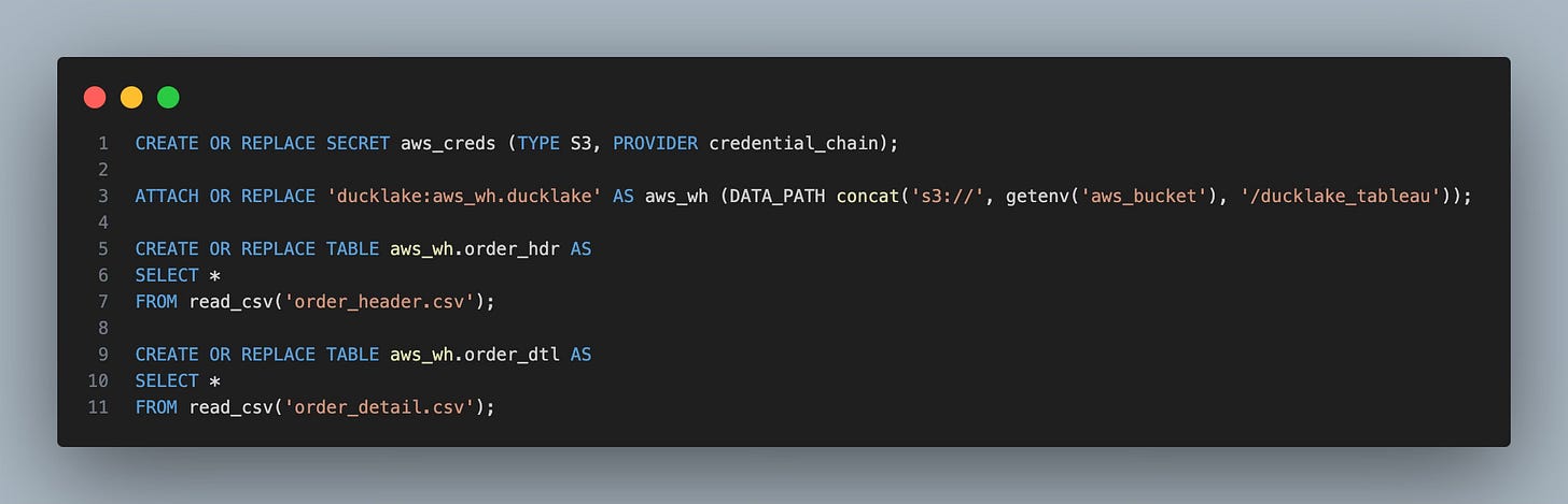 This article showed us how to create a simple ducklake lakehouse from scratch, inject some dummy data, send it up to S3, and then have Tableau connect and visualize it. In regards to other BI tools such as PowerBI, I have not done much research; but the kicker is that as long as the connector supports an “initial sql” block, you should be able to make it work.