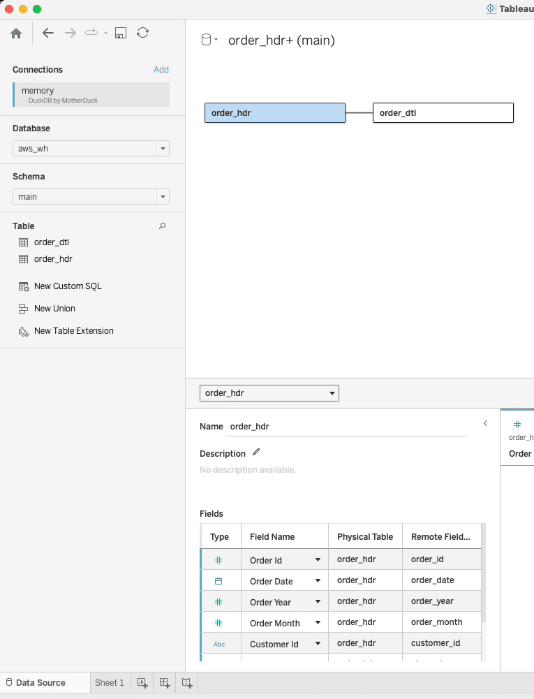 Under database, we should see our “aws_wh” we created with ducklake and attached. Then under main, we should see our tables. Let’s drag those on the canvas and start slicing: